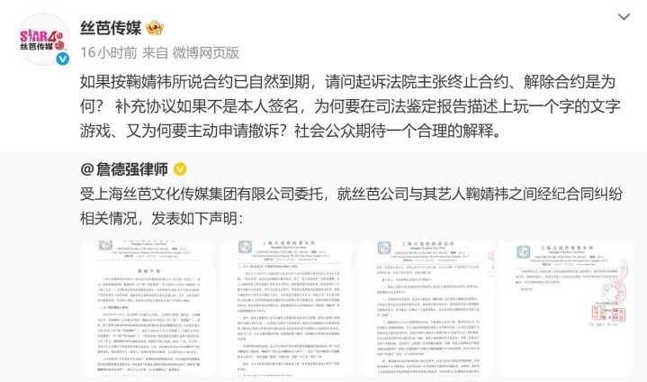 从合约到期时间的争执到收入分配的拉扯,再到签名真伪的鉴定争议。近日,丝芭与鞠婧祎这场“解约大戏”不断抛出新话题,霸占各大热搜榜单,俨然已经上升为一场“舆论战”,双方各执一词的隔空喊话,让网友眼花缭乱。